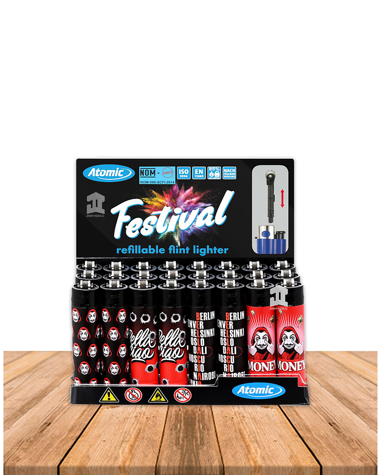 Display de encendedores Recargables (flint) marca Atomic, cada display contiene 24