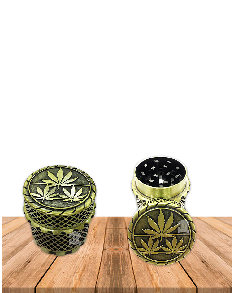 Moledores Metálico Engranaje Mallado , consta de 4 piezas con diseño de engranaje y mata de cannabis, versión con tapa el ideal para transportar y armar tus cigarrillos en donde desees.