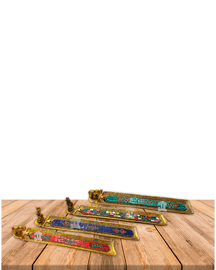 Tabla porta incienso en Forma rectangular Dorada de metal con aplicaciones de Colores, ideal para quemar inciensos en tu hogar.