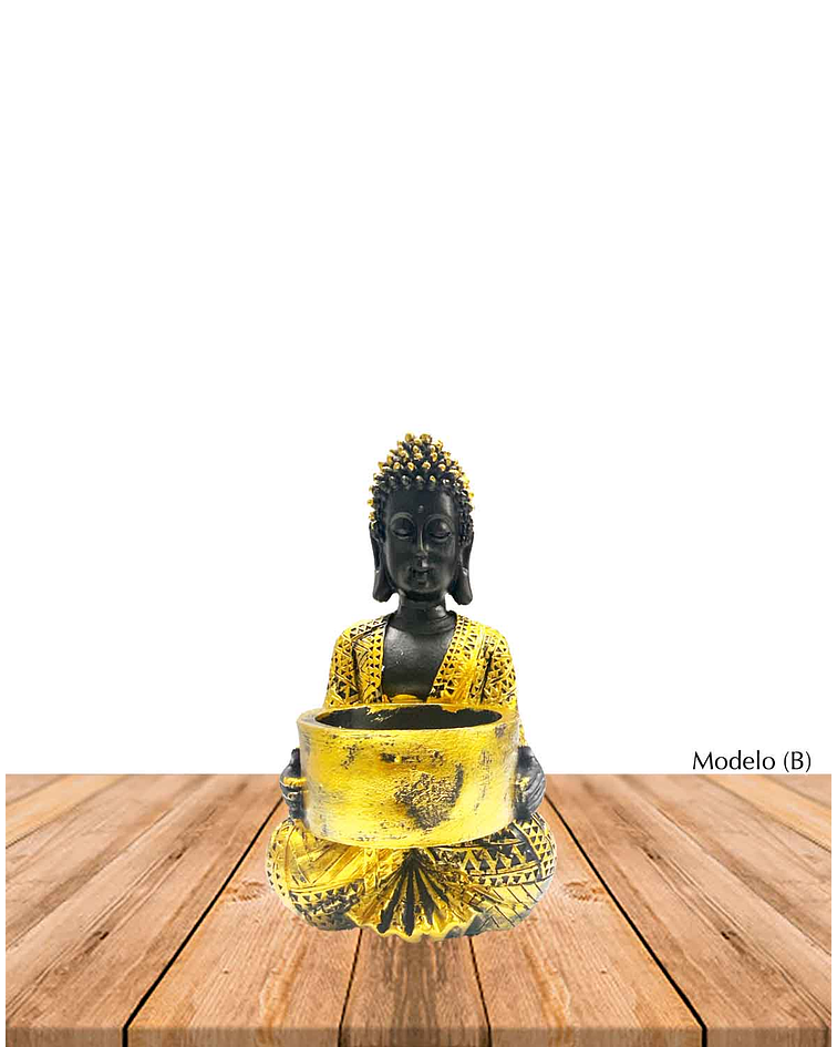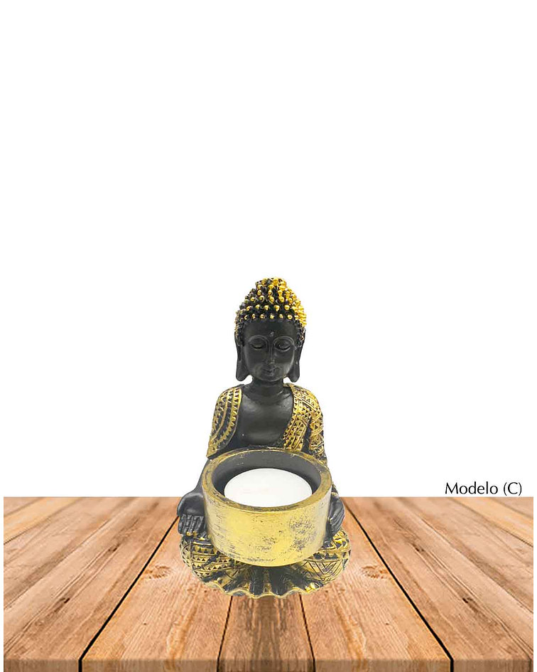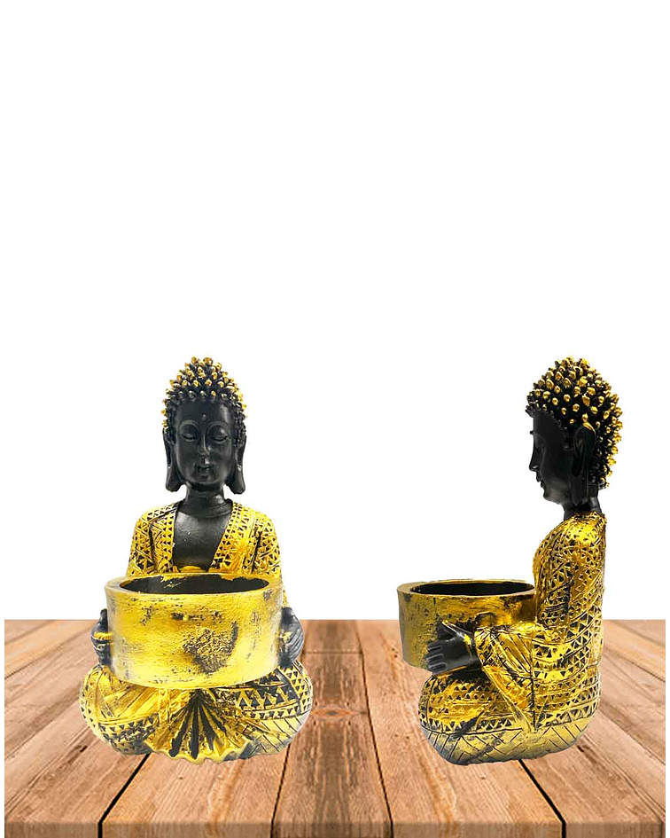 Hermoso porta vela con Figura de Buda en color negro con detalles dorados, ideales para adornar los lugares favoritos de tu hogar.