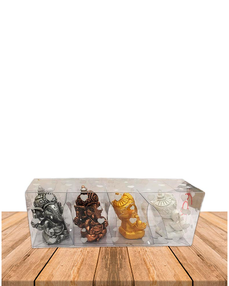 Set de Diosa Ganesh en Poliresina pequeña 2", consta de 4 piezas de diseño en poliresina con rasgos y detalles en color marcados de la diosa ganesh en cuatro colores.